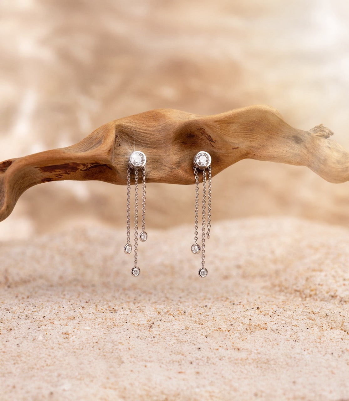 - Boucles d’oreilles pendantes, légères, presque mobiles.
